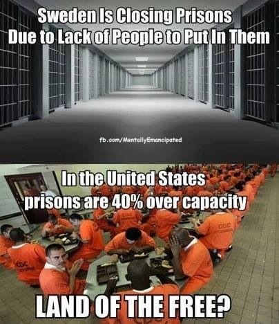 Sweden is closing prisons due to lack of people to put in them/In the United States prisons are 40% over capacity/LAND OF THE FREE? Share this: Share on X (Opens in new window) X Share on Facebook (Opens in new window) Facebook Share on Tumblr (Opens in new window) Tumblr Like Loading... Related Leave a comment Cancel reply Δ