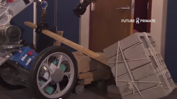“In this experiment, we design a complete rescue scenario with a 100 kg brick object blocking entry to a room and another 100 kg loaded cart. Interestingly, the loaded cart becomes a fulcrum for an arbitrary board to topple the bricks. Then the bricks, which were initially an obstacle, are used as a fulcrum for a lever to pry open the door. Finally the robot uses a wider board to create a bridge and perform the simulated rescue”.