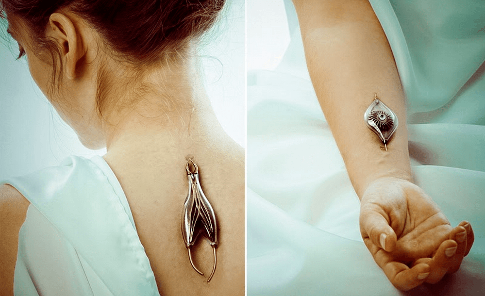 The jewelry is part of a project that Kizhner is calling “Energy Addicts”. The project includes three pieces: The Blinker, The E-pulse Conductor and The Blood Bridge.
