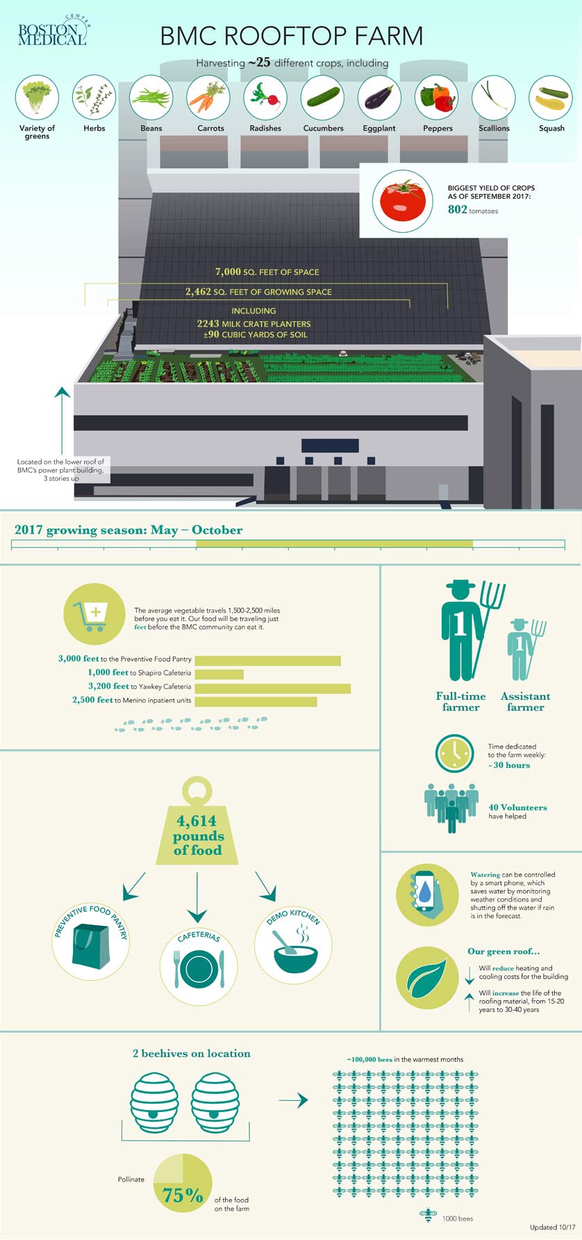 Three stories above BMC’s power plant thrives a 2,400 square foot farm with more than 25 crops. The farm not only provides fresh, local produce to our hospitalized patients, cafeterias, The Teaching Kitchen, and Preventive Food Pantry, but is also part of BMC’s commitment to going green. In addition to reducing the hospital’s carbon footprint, increasing green space, and reducing energy use, the farm also cuts the energy required to transport food.