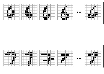 Examples of handwritten sixes and sevens arranged on a 10×10 grid. Each square on the grid is represented by a molecule in a specified concentration. Image: Nature