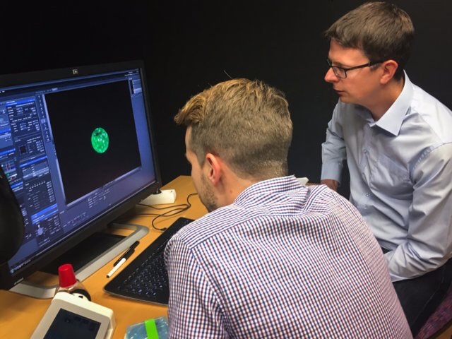 Fredrik Lanner of the Karolinska Institute in Stockholm and his student, Alvaro Plaza Reyes, examine a magnified image of an human embryo they used to attempt to create genetically modified healthy human embryos. Rob Stein/NPR