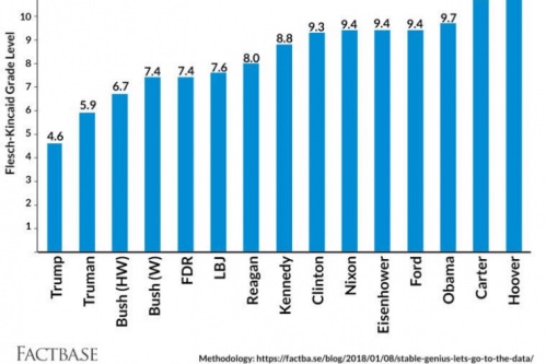 The words were run through a variety of lexicological analyses, besides the Flesch-Kincaid, and the results were the same. In every one, Trump came in dead last. Trump also uses the fewest “unique words” (2,605) of any president—Obama was the best at 4,869—and uses words with the fewest average syllables, with 1.33 per word, compared to positively multi-syllabic president Hoover at 1.57.