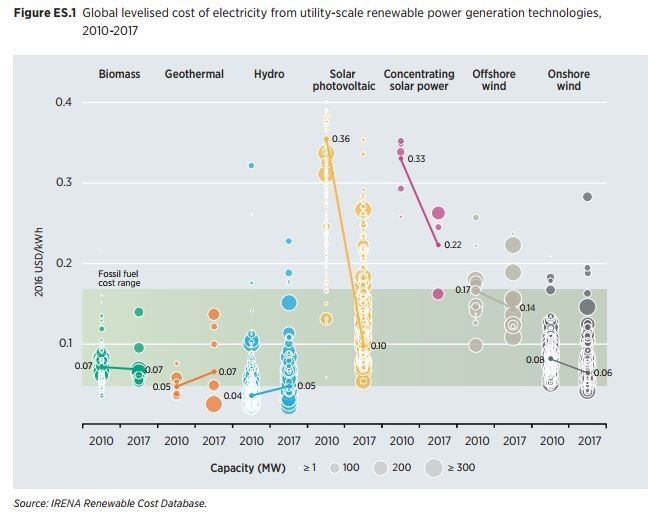 “Electricity from renewables will soon be consistently cheaper than from most fossil fuels,” the agency noted in their executive summary. “By 2020, all the renewable power generation technologies that are now in commercial use are expected to fall within the fossil fuel-fired cost range, with most at the lower end or undercutting fossil fuels.”