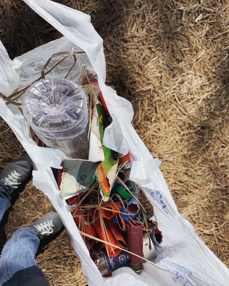 I found this plastic bag stuck in a bush near our campsite and decided to put it to use. Inside is every plastic shot gun shell I could find along with every piece of plastic and trash I could see within our campsite. This excludes the countless amount of spent ammo casings and glass bottles thrown into fire pits and used as targets that are nearly impossible to collect.